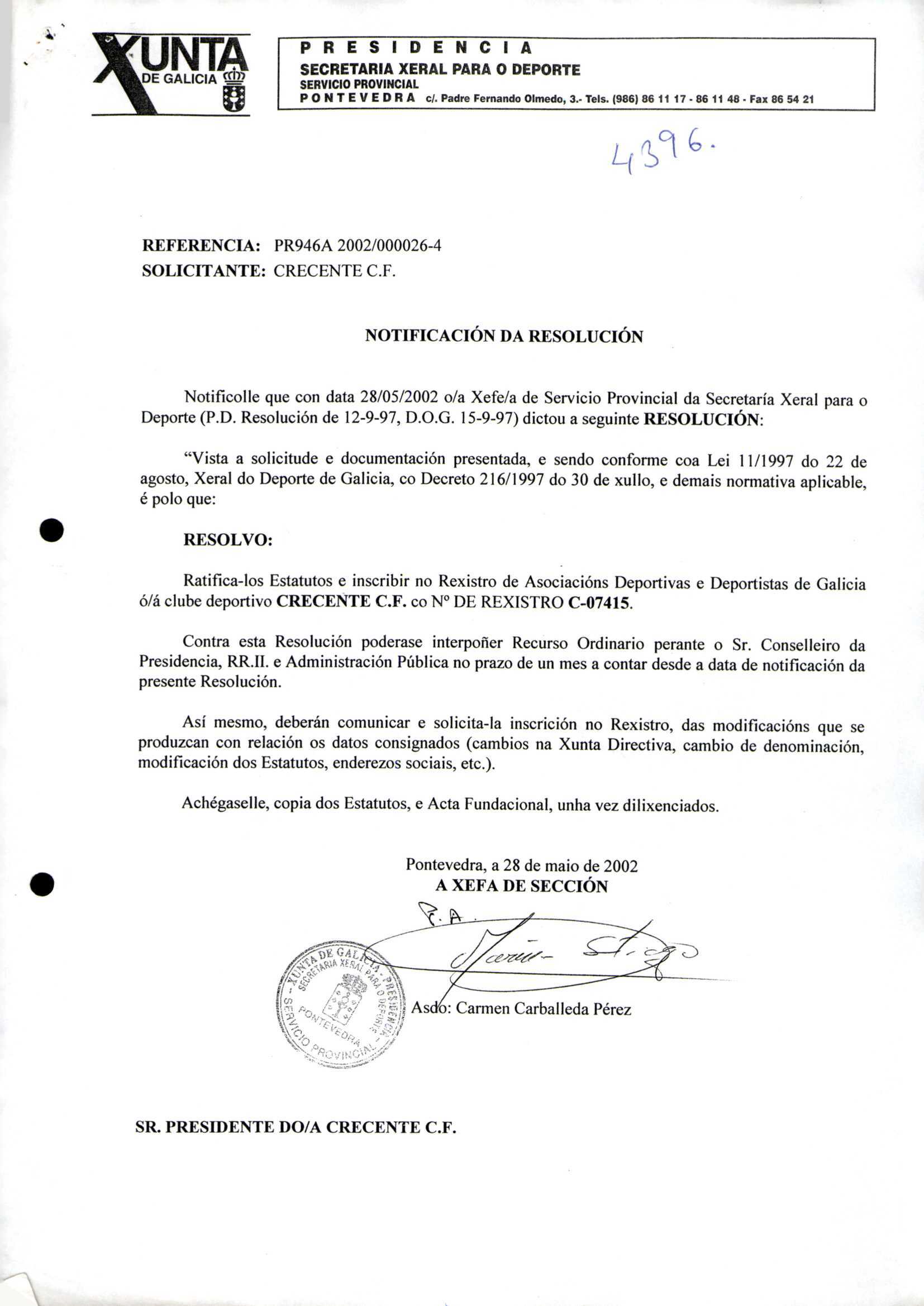 R. 4-396. CRECENTE C.F. Crecente